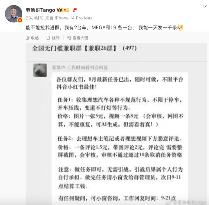 理想汽车法务部晒出的聊天截图显示,一位车主向理想客服反映,自己的车无缘无故被扔垃圾,现在网上铺天盖地的骂理想,很多车主都受牵连。他还称,现在打开抖音、小红书都在说乱停车或者不文明行为,这分明是有组织的蓄意攻击抹黑。“我们现在出门都感觉提心吊胆的,你们现在有什么措施吗?” 理想汽车产品线负责人汤靖8月6日在社交平台转发一张疑似网络水军组织抹黑理想汽车的兼职群聊天截图,并称:“能不能拉我进群,我有2台车,MEGA和L9各一台,我能一天发一千条。”